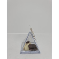 Contenant pyramide en plexi transparent très original et chic avec un moulin à vent, correspondra très bien à un baptême ou une communion. Avec à l'intérieur, 3 dragées amande Avola écrue et 4 dragées au chocolat taupe. Dragées de très bonne qualité dragées amande à 46 % et dragées chocolat à 70 % de cacao, vendus sur notre site pour partager avec vos...