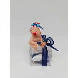 Contenant pot confiturier en verre pour baptême garçon avec un bébé bleu. Avec à l 'intérieur 4 dragées Avola amande blanche, 5 dragées au chocolat de couleur bleu ciel et 7 billes argentées. Dragées de très bonnes qualités, amande 46 %, chocolat 70 % de cacao vendus aussi sur notre site pour partager avec vos convives au moment du café et du dessert.