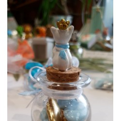Pot en verre rond avec petit prince renard, avec sa couronne couleur or. Conviendra au thème renard ou petit prince et son étiquette rectangulaire pour le prénom et la date de l 'événement.. Avec à l 'intérieur 3 dragées amandes avola blanches de très bonne qualité, 2 dragées chocolat bleue ciel et 2 dragées chocolat couleur or. Dragées de très bonnes...