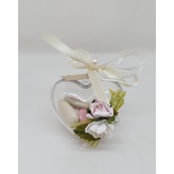 Contenant cœur en plexi transparent, chic et original avec son bouquet de fleur sur le côté du cœur. Conviendra au thème chic , romantique et nature. Avec à l 'intérieur 3 dragées amandes avola, 2 dragées au chocolat écrue et 2 dragées au chocolat rose. Dragées de très bonne qualité, amande à 42 % et chocolat à 70 % de cacao, vendus aussi sur notre site...