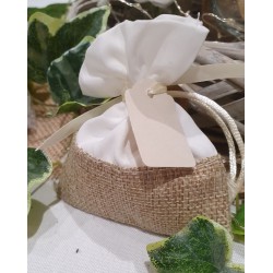 NOUVEAUTE 2021 Pochon en toile de jute et tissu coton blanc avec franges, modèle qui conviendra au thème Bohémien ou Champêtre. Une étiquette avec prénoms et date de l 'événement cartonnée écrue. A l 'intérieur 3 dragées amandes avola écrue et 4 dragées au chocolat Taupe. Dragées de très bonne qualité avec une amande à 42 % et chocolat à 70 % de...
