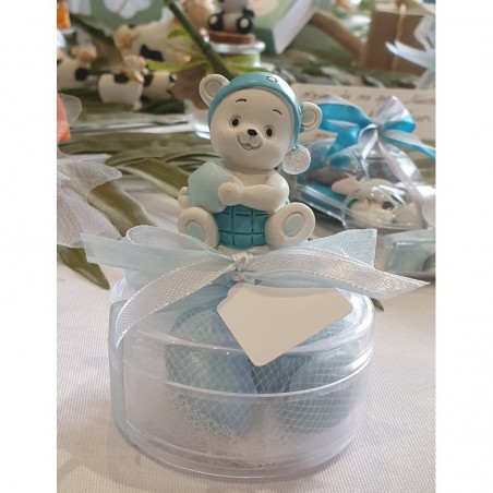 PROMOTION / Boîte ronde en plexi avec un Joli ourson bleu et son bonnet de nuit