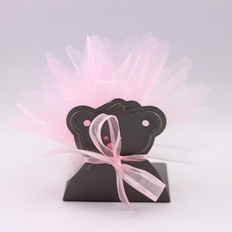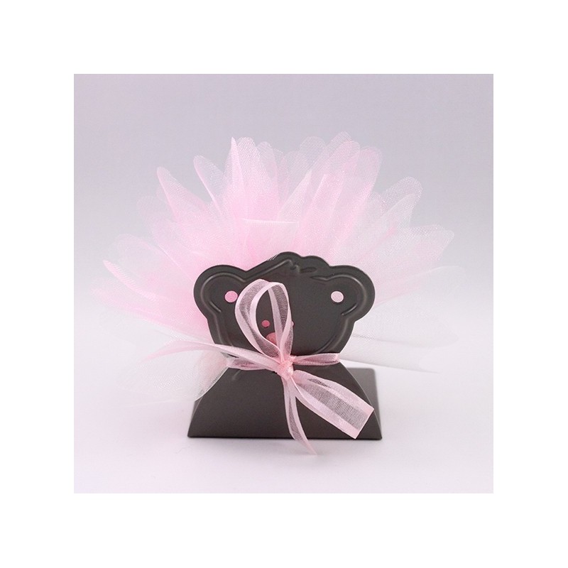 Contenant ourson métal, porte bougie avec un pochon à dragées rose.