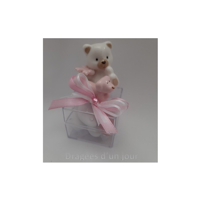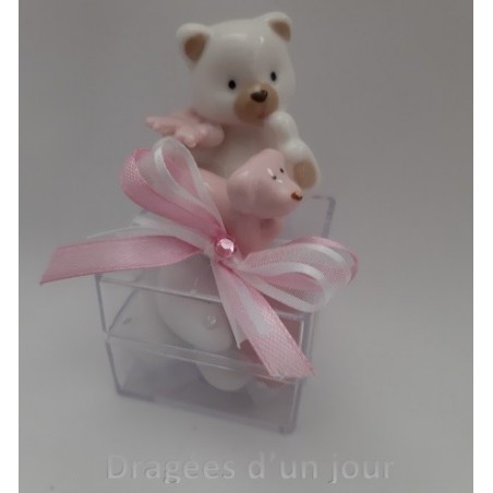 Contenant dragées cube plexi avec ourson en porcelaine petit chien rose.