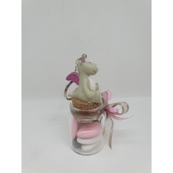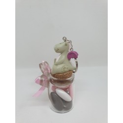 Contenant pot en verre avec figurine porte clef de la collection Noukies Lucie et Victoria. Avec à l 'intérieur, 3 dragées amande Avola blanche, 2 dragées chocolat rose et 2 dragées chocolat taupe. Dragées de très bonne qualité avec une amande à 46 % et chocolat à 70 % de cacao, vendus sur notre site pour partager avec vos convives...