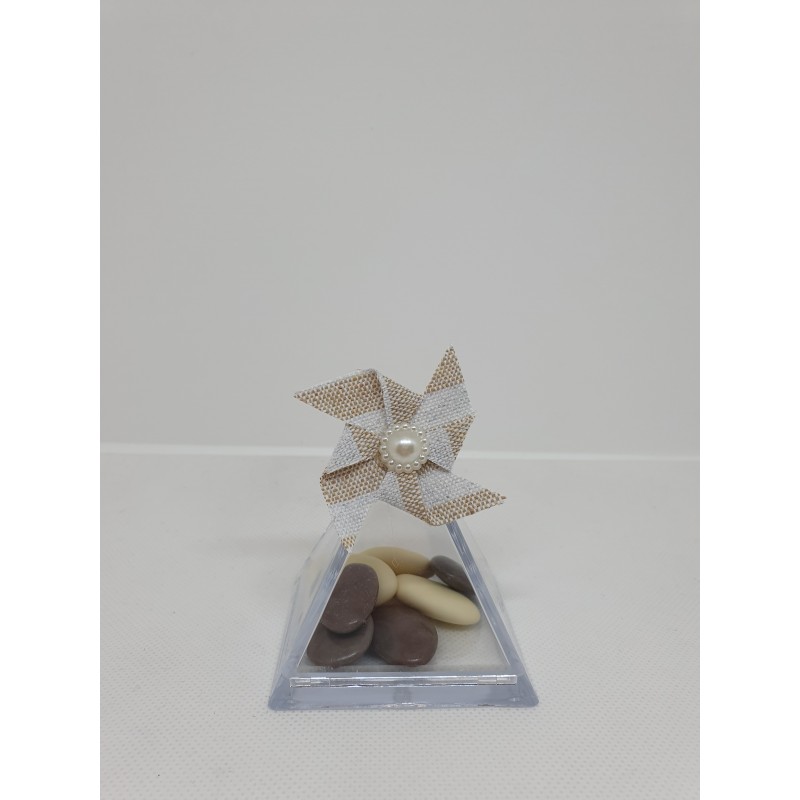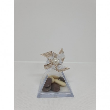 Avec à l'intérieur, 3 dragées amande Avola écrue et 4 dragées au chocolat taupe.