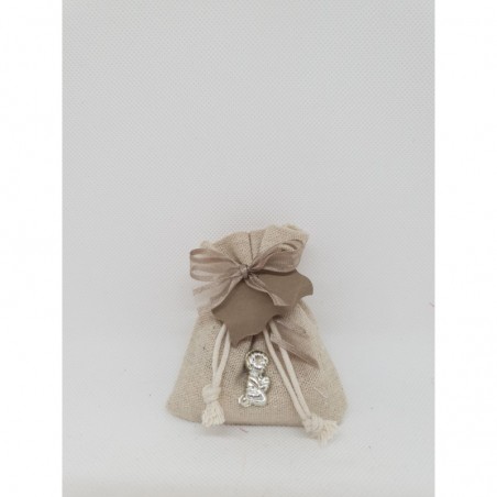 Contenant à dragées pochon effet lin avec petit communiant argent,