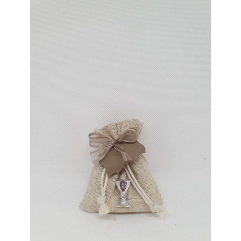 Contenant pochon pour communion effet lin avec un calice argenté,
