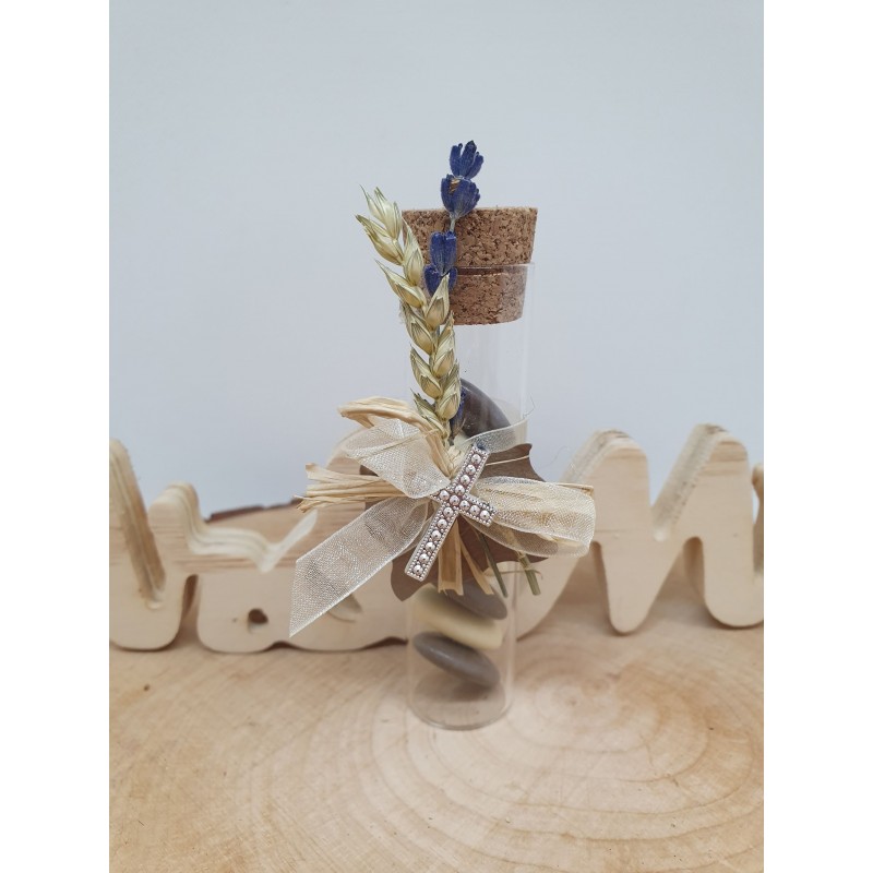 Contenant tube en verre très joli avec lavande et blé naturels.