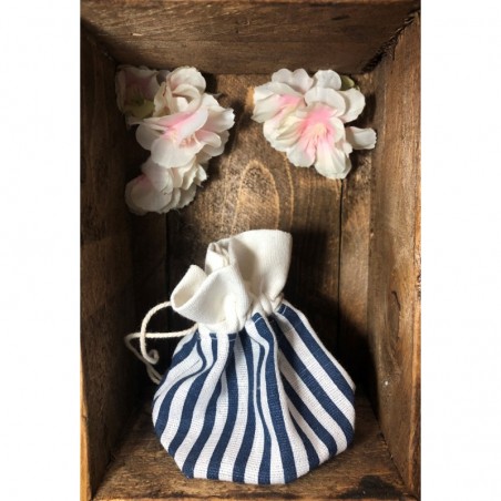 Contenant à dragées pochon de très belle qualité à rayures (blanc et bleu marine), avec décoration d'une Avec à l 'intérieur 3 dragées Avola amande blanche et 4 dragées chocolat bleu marine. Dragées de très bonne qualité, amande à 46 %, chocolat à 70 % de cacao, vendus aussi sur notre site pour partager avec vos convives au moment du café et du...