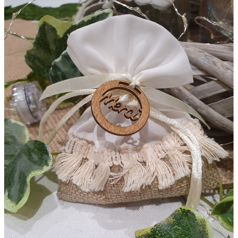 Pochon en toile de jute et tissu coton blanc avec franges,
