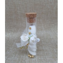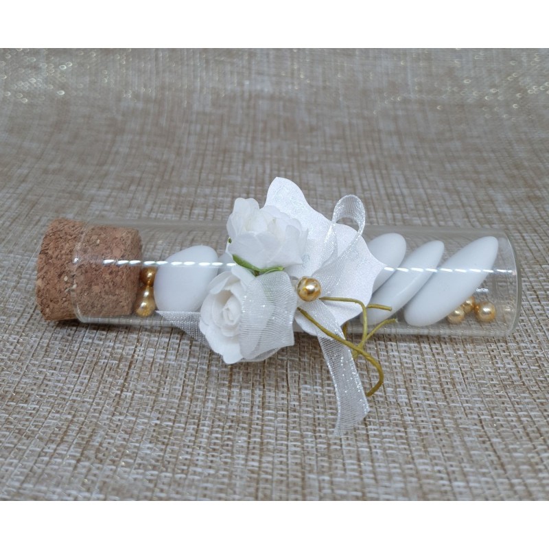 Contenant dragées tube en verre, très chic, blanc et or,