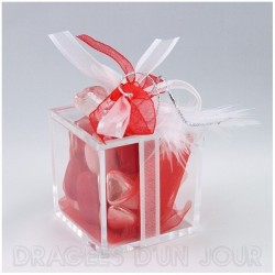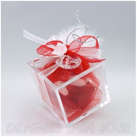 Contenant cube en plexi transparent, dans le rouge et le blanc avec une touche d'argentée et un cœur effet cristal.correspondra au thème chic et élégant.