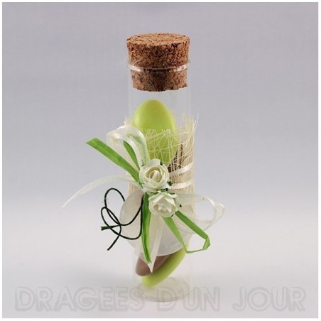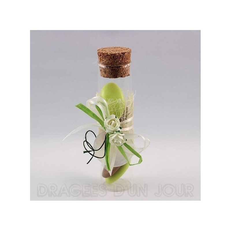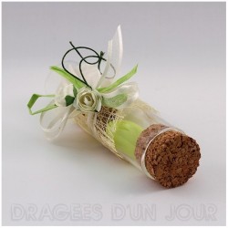Contenant pour dragées éprouvette en verre 10 cm, modèle chic et champêtre.